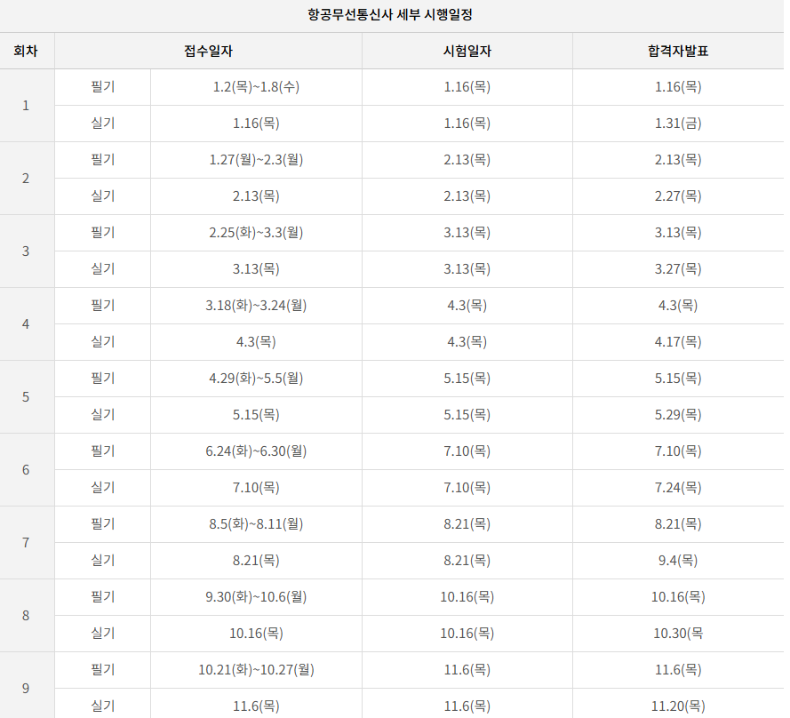 육상 무선 통신사에 이어 바로 항공 무선 통신사를 취득했다. 1. 자격등 정보1) 시험 일정2025년 항공 무선 통신사 필기, 실기 시험 일정이다. 필기는 접수일자에 지원하면 된다. 하지만 실기는 당일 항공 무선 통신사 필기 합격자들에게 필기시험이 끝난 후 실기를 지원하라고 문자가 온다. 그 문자가 오면 다시 필기 지원했을 때랑 똑같이 홈페이지에 들어가서 지원하면 된다. 2) 응시 금액응시 수수료는 필기 28,000원/실기 33,000원이다. 3) 시험 과목- 필기 필기시험은 총 4가지로 전파법규, 통신보안, 기초전파공학, 영어다. 육상 무선 통신사와 마찬가지로 각 과목이 40점 이상, 평균이 60점 이상이면 합격이다. 만약 위 자격증이 있으면 해당하는 과목에서 면제받을 수 있다. - 실기실기 과..