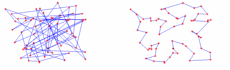 빨간 점을 지역이라고 하면, 왼쪽은 최적화되지 않은, 마음대로 이동한 것이고, 오른쪽은 최적화하여 가장 적게 이동한 것이다.