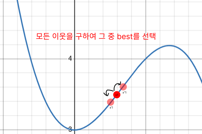 현재 위치에서 주변의 모든 neighbors를 보고 그중 가장 좋은(best) value인 state로 이동하면서 min을 찾는 알고리즘이다.