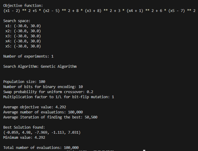 1. Genetic Algorithm생물체가 환경에 적응해 나가면서 진화하는 모습(적자생존)을 모방하여 최적의 value를 찾는 알고리즘이다. 적자생존- 환경에 적합한 개체는 살아남는다.- 살아남은 개체는 자손을 낳는다. - 이때 자손은 부모의 유전자를 받고, 때때로는 돌연변이가 나타난다. 위 알고리즘을 모방한 것이 Genetic Algorithm이다. 1) 초기 염색체 집합을 생성2) 초기 염색체들에 대한 적합도 계산while : 3) 자손 염색체 생성 4) 자손 염색체들에 대한 적합도 계산 5) 부모 염색체와 자손 염색체 적합도 비교 XR = 0.1mR = 0.9popSize = 100limitEval = 100000resolution = 10DELTA = 0.01numEval = ..